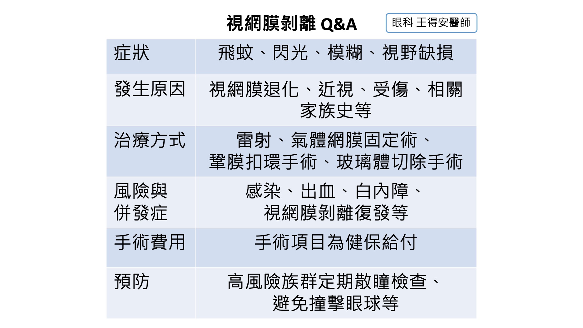 以下先用表格整理出視網膜剝離的相關重點,接著會再深入說明各個細節: